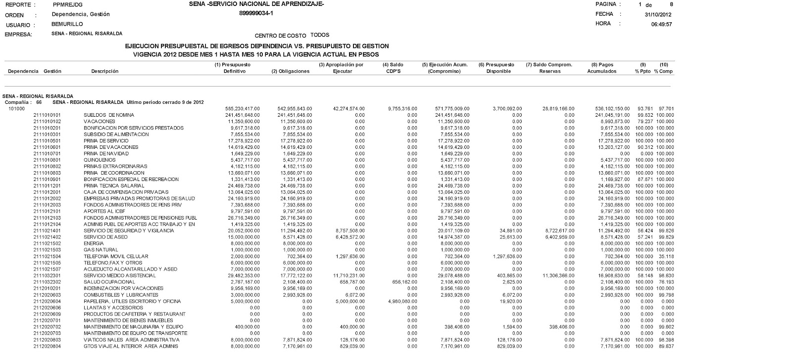El SENA Risaralda publica mes a mes las cifras correspondientes a la Ejecución Presupuestal; en este caso, al 30 de octubre de 2012 de la Dirección Regional